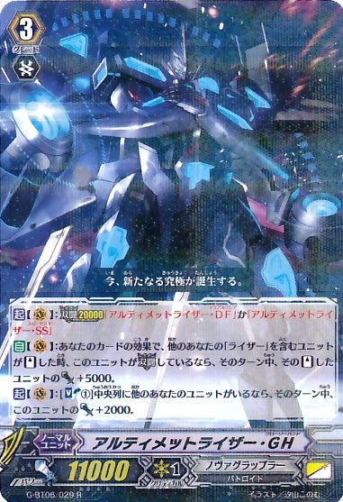 【起】【(V)】:【双闘20000】「アルティメットライザー・DF」か「アルティメットライザー・SS」【自】【(V)】:あなたのカードの効果で、他のあなたの「ライザー」を含むユニットが【スタンド】した時、このユニットが【双闘】しているなら、そのターン中、その【スタンド】したユニットのパワー+5000。【起】【(V)】:[【ソウルブラスト】(1)]中央列に他のあなたのユニットがいるなら、そのターン中、このユニットのパワー+2000。