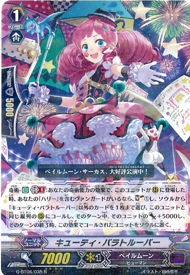 奇術-【自】【Gブレイク】(1):あなたの奇術能力の効果で、このユニットが(R)に登場した時、あなたの「ハリー」を含むヴァンガードがいるなら、【ソウルチャージ】(1)し、ソウルから「キューティ・パラトルーパー」以外のカードを1枚まで選び、このユニットと同じ縦列の(R)にコールし、そのターン中、そのユニットのパワー+5000し、そのターンの終了時、この効果でコールされたユニットをソウルに置く。