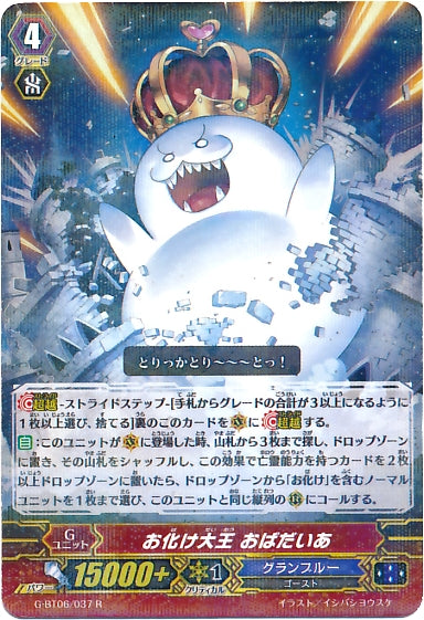 【超越】-ストライドステップ-[手札からグレードの合計が3以上になるように1枚以上選び、捨てる]裏のこのカードを(V)に【超越】する。【自】:このユニットが(V)に登場した時、山札から3枚まで探し、ドロップゾーンに置き、その山札をシャッフルし、この効果で亡霊能力を持つカードを2枚以上ドロップゾーンに置いたら、ドロップゾーンから「お化け」を含むノーマルユニットを1枚まで選び、このユニットと同じ縦列の(R)にコールする。