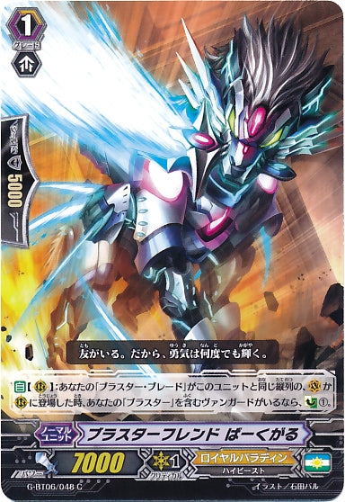 【自】【(R)】:あなたの「ブラスター・ブレード」がこのユニットと同じ縦列の、(V)か(R)に登場した時、あなたの「ブラスター」を含むヴァンガードがいるなら、【カウンターチャージ】(1)。