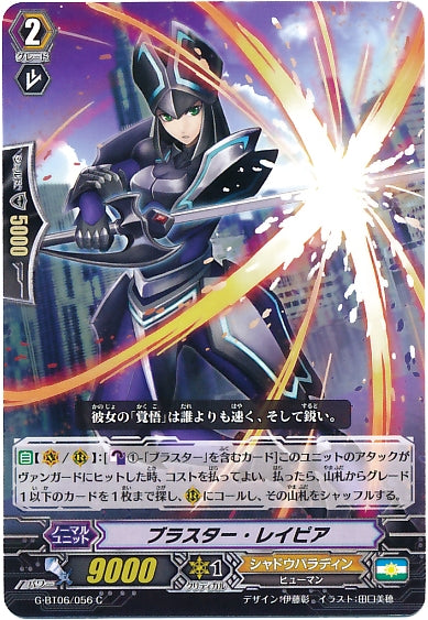 【自】【(V)/(R)】:[【カウンターブラスト】(1)-「ブラスター」を含むカード]このユニットのアタックがヴァンガードにヒットした時、コストを払ってよい。払ったら、山札からグレード1以下のカードを1枚まで探し、(R)にコールし、その山札をシャッフルする。