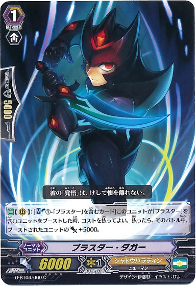 【自】【(R)】:[【ソウルブラスト】(1)-「ブラスター」を含むカード]このユニットが「ブラスター」を含むユニットをブーストした時、コストを払ってよい。払ったら、そのバトル中、ブーストされたユニットのパワー+5000。
