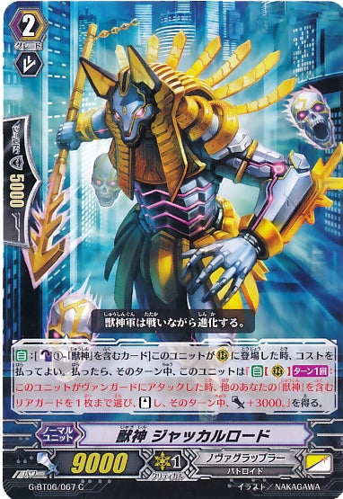 【自】:[【カウンターブラスト】(1)-「獣神」を含むカード]このユニットが(R)に登場した時、コストを払ってよい。払ったら、そのターン中、このユニットは『【自】【(R)】【ターン1回】:このユニットがヴァンガードにアタックした時、他のあなたの「獣神」を含むリアガードを1枚まで選び、【スタンド】し、そのターン中、パワー+3000。』を得る。
