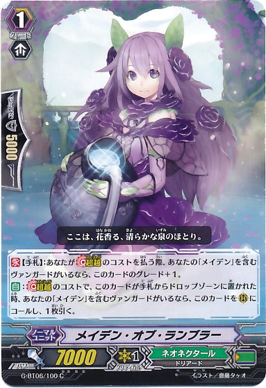 【永】【手札】:あなたが【超越】のコストを払う際、あなたの「メイデン」を含むヴァンガードがいるなら、このカードのグレード+1。【自】:【超越】のコストで、このカードが手札からドロップゾーンに置かれた時、あなたの「メイデン」を含むヴァンガードがいるなら、このカードを(R)にコールし、1枚引く。