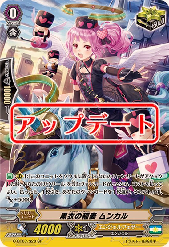 アップデート:シールド、トリガー、テキスト【自】【(R)】:「ガウリール」を含むグレード3以上のあなたのヴァンガードがアタックした時、【コスト】[このユニットをソウルに置く]ことで、1枚引き、あなたのヴァンガードを1枚選び、そのバトル中、パワー+5000。【自】:このカードがダメージチェックで出た時、1枚引く。