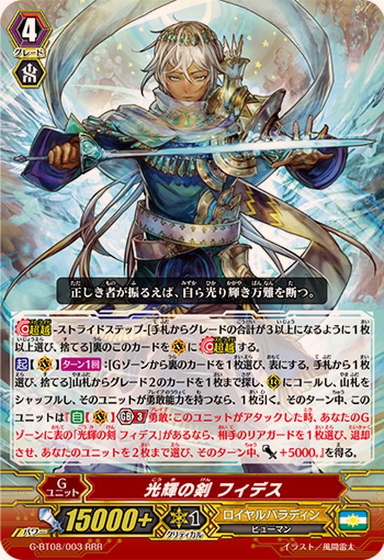 【超越】-ストライドステップ-[手札からグレードの合計が3以上になるように1枚以上選び、捨てる]裏のこのカードを(V)に【超越】する。【起】【(V)】【ターン1回】:[Gゾーンから裏のカードを1枚選び、表にする,手札から1枚選び、捨てる]山札からグレード2のカードを1枚まで探し、(R)にコールし、山札をシャッフルし、そのユニットが勇敢能力を持つなら、1枚引く。そのターン中、このユニットは『【自】【(V)】【Gブレイク】(3)勇敢:このユニットがアタックした時、あなたのGゾーンに表の「光輝の剣 フィデス」があるなら、相手のリアガードを1枚選び、退却させ、あなたのユニットを2枚まで選び、そのターン中、パワー+5000。』を得る。