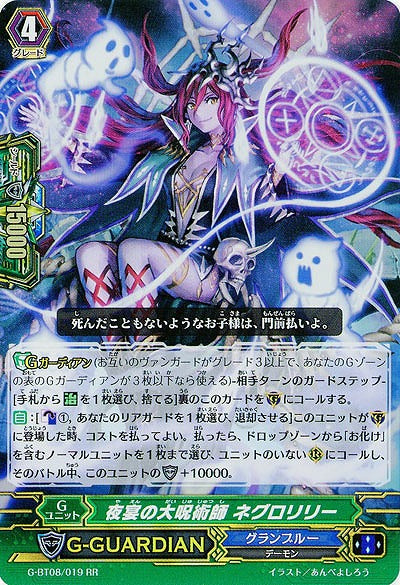 【Gガーディアン】(お互いのヴァンガードがグレード3以上で、あなたのGゾーンの表のGガーディアンが3枚以下なら使える)-相手ターンのガードステップ-[手札から【治】を1枚選び、捨てる]裏のこのカードを(G)にコールする。【自】:[【カウンターブラスト】(1),あなたのリアガードを1枚選び、退却させる]このユニットが(G)に登場した時、コストを払ってよい。払ったら、ドロップゾーンから「お化け」を含むノーマルユニットを1枚まで選び、ユニットのいない(R)にコールし、そのバトル中、このユニットのシールド+10000。