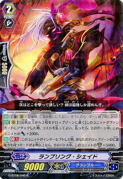 【自】:亡霊((R)に登場時、亡霊状態にしてよい。そうしたら、ターン終了時に退却)【自】【(R)】:[山札の上から2枚をドロップゾーンに置く]このユニットがヴァンガードにアタックした時、コストを払ってよい。払ったら、そのターン中、このユニットのパワー+2000。【自】【Gブレイク】(1):このユニットがインターセプトした時、あなたのドロップゾーンの亡霊能力を持つカードが4枚以上なら、そのバトル中、このユニットのシールド+5000。
