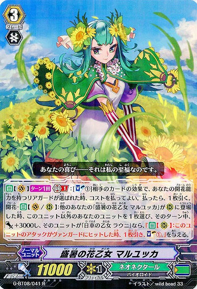 【自】【(V)】【ターン1回】【Gブレイク】(1):[【ソウルブラスト】(1)]相手のカードの効果で、あなたの開花能力を持つリアガードが選ばれた時、コストを払ってよい。払ったら、1枚引く。開花-【自】【(V)/(R)】:他のあなたの「盛暑の花乙女 マルユッカ」が(R)に登場した時、このユニット以外のあなたのユニットを1枚選び、そのターン中、パワー+3000し、そのユニットが「日車の乙女 ラウニ」なら、『【自】【(R)】:このユニットのアタックがヴァンガードにヒットした時、1枚引き、【ソウルチャージ】(1)。』を与える。