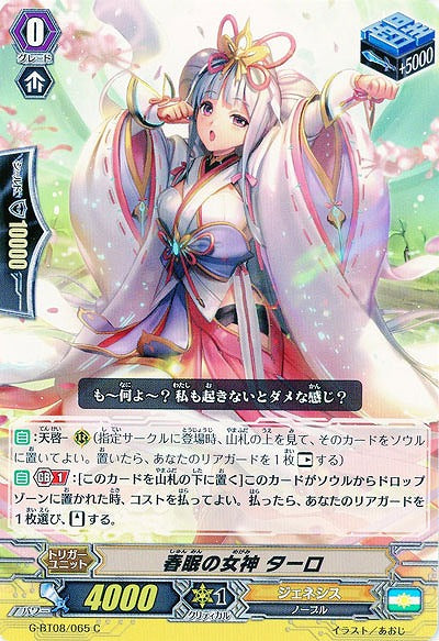 【自】:天啓-(R)(指定サークルに登場時、山札の上を見て、そのカードをソウルに置いてよい。置いたら、あなたのリアガードを1枚【レスト】する)【自】【Gブレイク】(1):[このカードを山札の下に置く]このカードがソウルからドロップゾーンに置かれた時、コストを払ってよい。払ったら、あなたのリアガードを1枚選び、【スタンド】する。