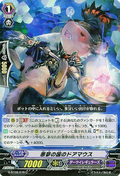 【起】【(R)】【Gブレイク】(1):[このユニットを【レスト】する]あなたのヴァンガードを1枚選び、そのターン中、ソウルの「悪夢の国」を含むカード1枚につき、パワー+1000。【自】:このユニットが(R)からドロップゾーンに置かれた時、【ソウルチャージ】(1)。さらに、それがあなたのターン中なら、あなたの「悪夢の国」を含むユニットを1枚選び、そのターン中、パワー+4000。