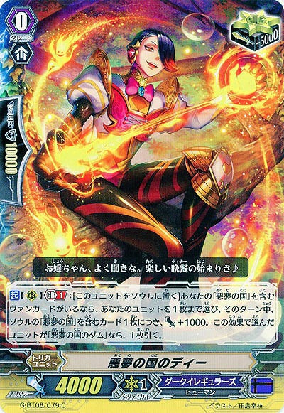 【起】【(R)】【Gブレイク】(1):[このユニットをソウルに置く]あなたの「悪夢の国」を含むヴァンガードがいるなら、あなたのユニットを1枚まで選び、そのターン中、ソウルの「悪夢の国」を含むカード1枚につき、パワー+1000。この効果で選んだユニットが「悪夢の国のダム」なら、1枚引く。