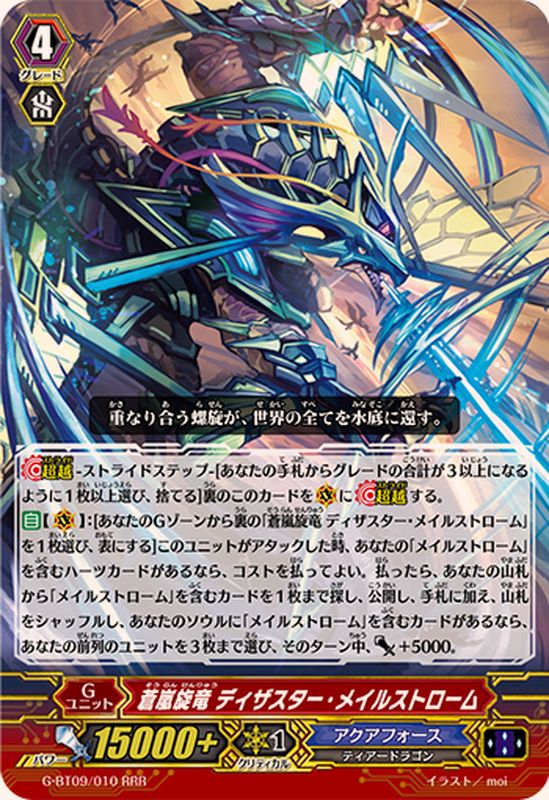 【超越】-ストライドステップ-[あなたの手札からグレードの合計が3以上になるように1枚以上選び、捨てる]裏のこのカードを(V)に【超越】する。【自】【(V)】:[あなたのGゾーンから裏の「蒼嵐旋竜 ディザスター・メイルストローム」を1枚選び、表にする]このユニットがアタックした時、あなたの「メイルストローム」を含むハーツカードがあるなら、コストを払ってよい。払ったら、あなたの山札から「メイルストローム」を含むカードを1枚まで探し、公開し、手札に加え、山札をシャッフルし、あなたのソウルに「メイルストローム」を含むカードがあるなら、あなたの前列のユニットを3枚まで選び、そのターン中、パワー+5000。