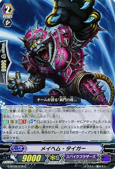 【自】:突撃(効果で(R)に登場したターン中、突撃状態にしてよい。そうしたら、参加したバトル終了時に山札の下に置く)【自】【(R)】【Gブレイク】(1):[【ソウルブラスト】(1)]このユニットがヴァンガードにアタックしたバトル中、相手のユニットが(G)に置かれた時、このユニットが突撃状態なら、コストを払ってよい。払ったら、相手のグレード2以下のガーディアンを1枚選び、退却させる。