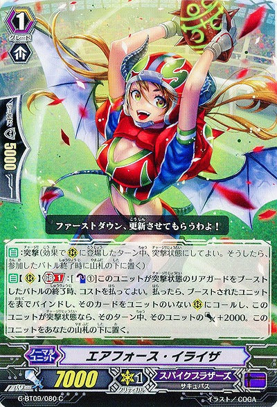【自】:突撃(効果で(R)に登場したターン中、突撃状態にしてよい。そうしたら、参加したバトル終了時に山札の下に置く)【自】【(R)】【Gブレイク】(1):[【カウンターブラスト】(1)]このユニットが突撃状態のリアガードをブーストしたバトルの終了時、コストを払ってよい。払ったら、ブーストされたユニットを表でバインドし、そのカードをユニットのいない(R)にコールし、このユニットが突撃状態なら、そのターン中、そのユニットのパワー+2000。このユニットをあなたの山札の下に置く。