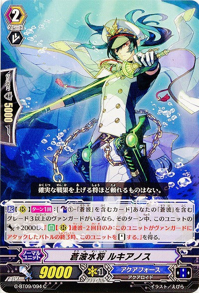 【起】【(R)】【ターン1回】:[【カウンターブラスト】(1)-「蒼波」を含むカード]あなたの「蒼波」を含むグレード3以上のヴァンガードがいるなら、そのターン中、このユニットのパワー+2000し、『【自】【(R)】連波-2回目のみ:このユニットがヴァンガードにアタックしたバトルの終了時、このユニットを【スタンド】する。』を得る。