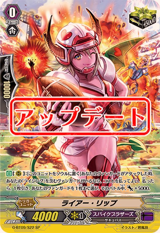 アップデート:シールド、トリガー、テキスト【自】【(R)】:「ライジング」を含むグレード3以上のあなたのヴァンガードがアタックした時、【コスト】[このユニットをソウルに置く]ことで、1枚引き、あなたのヴァンガードを1枚選び、そのバトル中、パワー+5000。【自】:このカードがダメージチェックで出た時、1枚引く。