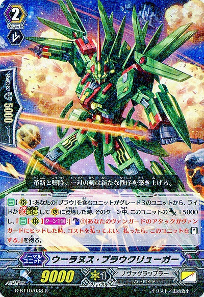 【自】【(R)】:あなたの「ブラウ」を含むユニットがグレード3のユニットから、ライドか【超越】して(V)に登場した時、そのターン中、このユニットのパワー+5000し、『【自】【(R)】【ターン1回】:[【カウンターブラスト】(1)]あなたのヴァンガードのアタックがヴァンガードにヒットした時、コストを払ってよい。払ったら、このユニットを【スタンド】する。』を得る。