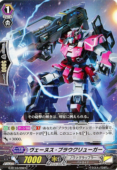 【自】【(R)】【ターン1回】【Gブレイク】(1):あなたの「ブラウ」を含むヴァンガードの効果で、他のあなたのリアガードが【スタンド】した時、このユニットを【スタンド】し、そのターン中、パワー+3000。