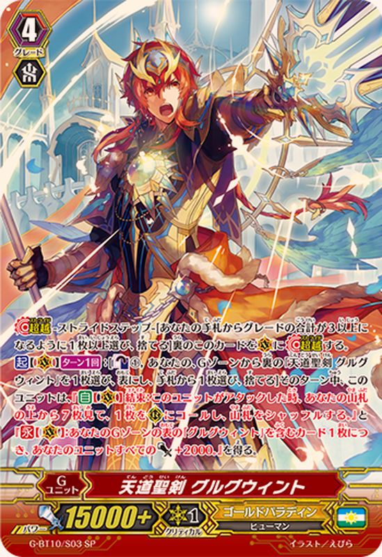 【超越】-ストライドステップ-[あなたの手札からグレードの合計が3以上になるように1枚以上選び、捨てる]裏のこのカードを(V)に【超越】する。【起】【(V)】【ターン1回】:[【カウンターブラスト】(1),あなたの、Gゾーンから裏の「天道聖剣 グルグウィント」を1枚選び、表にし、手札から1枚選び、捨てる]そのターン中、このユニットは、『【自】【(V)】結束:このユニットがアタックした時、あなたの山札の上から7枚見て、1枚を(R)にコールし、山札をシャッフルする。』と『【永】【(V)】:あなたのGゾーンの表の「グルグウィント」を含むカード1枚につき、あなたのユニットすべてのパワー+2000。』を得る。