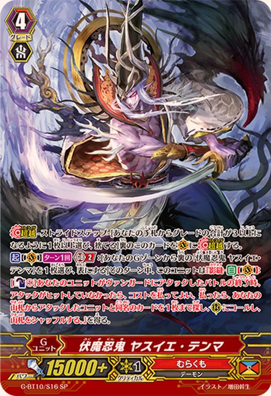 【超越】-ストライドステップ-[あなたの手札からグレードの合計が3以上になるように1枚以上選び、捨てる]裏のこのカードを(V)に【超越】する。【起】【(V)】【ターン1回】【Gブレイク】(2):[あなたのGゾーンから裏の「伏魔忍鬼 ヤスイエ・テンマ」を1枚選び、表にする]そのターン中、このユニットは『影縫-【自】【(V)】:[【カウンターブラスト】(1)]あなたのユニットがヴァンガードにアタックしたバトルの終了時、アタックがヒットしていなかったら、コストを払ってよい。払ったら、あなたの山札からアタックしたユニットと同名のカードを1枚まで探し、(R)にコールし、山札をシャッフルする。』を得る。