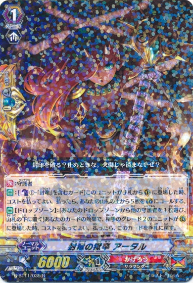 【永】:守護者【自】:[【カウンターブラスト】(1)-「封竜」を含むカード]このユニットが手札から(G)に登場した時、コストを払ってよい。払ったら、あなたの山札の上から5枚を(G)にコールする。【自】【ドロップゾーン】:[あなたのドロップゾーンから他の守護者を1枚選び、山札の下に置く]あなたのカードの効果で、相手のグレード2のユニットが(R)に登場した時、コストを払ってよい。払ったら、このカードを手札に戻す。