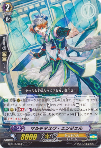 【自】:天啓-(R)(指定サークルに登場時、山札の上を見て、そのカードをソウルに置いてよい。置いたら、あなたの【スタンド】のリアガードを1枚【レスト】する)【自】【(R)】【Gブレイク】(1):[【カウンターブラスト】(1)]あなたの他のカードの効果で、このユニットが【レスト】された時、コストを払ってよい。払ったら、このユニットを【スタンド】し、そのターン中、『ブースト』を得る。
