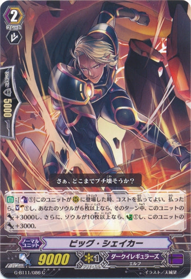 【自】:[【カウンターブラスト】(1)]このユニットが(R)に登場した時、コストを払ってよい。払ったら、【ソウルチャージ】(1)し、あなたのソウルが6枚以上なら、そのターン中、このユニットのパワー+3000し、さらに、ソウルが10枚以上なら、【カウンターチャージ】(1)し、このユニットのパワー+3000。