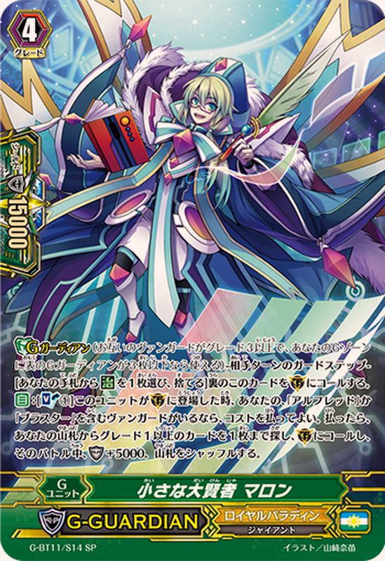【Gガーディアン】(お互いのヴァンガードがグレード3以上で、あなたのGゾーンに表のGガーディアンが3枚以下なら使える)-相手ターンのガードステップ-[あなたの手札から【治】を1枚選び、捨てる]裏のこのカードを(G)にコールする。【自】:[【ソウルブラスト】(1)]このユニットが(G)に登場した時、あなたの、「アルフレッド」か「ブラスター」を含むヴァンガードがいるなら、コストを払ってよい。払ったら、あなたの山札からグレード1以上のカードを1枚まで探し、(G)にコールし、そのバトル中、シールド+5000。山札をシャッフルする。
