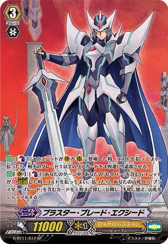 【自】:[【カウンターブラスト】(1)]このユニットが(V)か(R)に登場した時、コストを払ってよい。払ったら、相手のグレード1以上のリアガードを1枚選び、退却させる。【自】【(V)】:[【カウンターブラスト】(1)]あなたのターン中、あなたの「セイバー」を含むGユニットが【超越】した時、コストを払ってよい。払ったら、あなたの山札から「ブラスター・ブレード」を含むカードを1枚まで探し、公開し、手札に加え、山札をシャッフルする。
