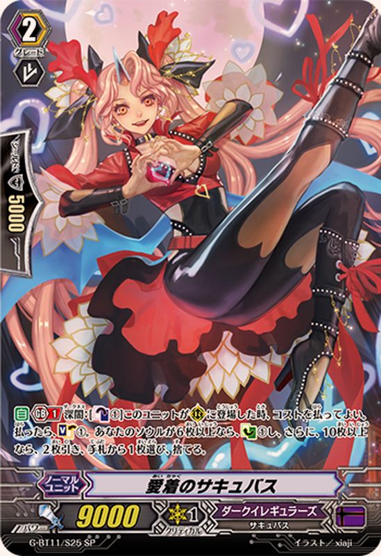 【自】【Gブレイク】(1)深闇:[【カウンターブラスト】(1)]このユニットが(R)に登場した時、コストを払ってよい。払ったら、【ソウルチャージ】(1)。あなたのソウルが6枚以上なら、【カウンターチャージ】(1)し、さらに、10枚以上なら、2枚引き、手札から1枚選び、捨てる。