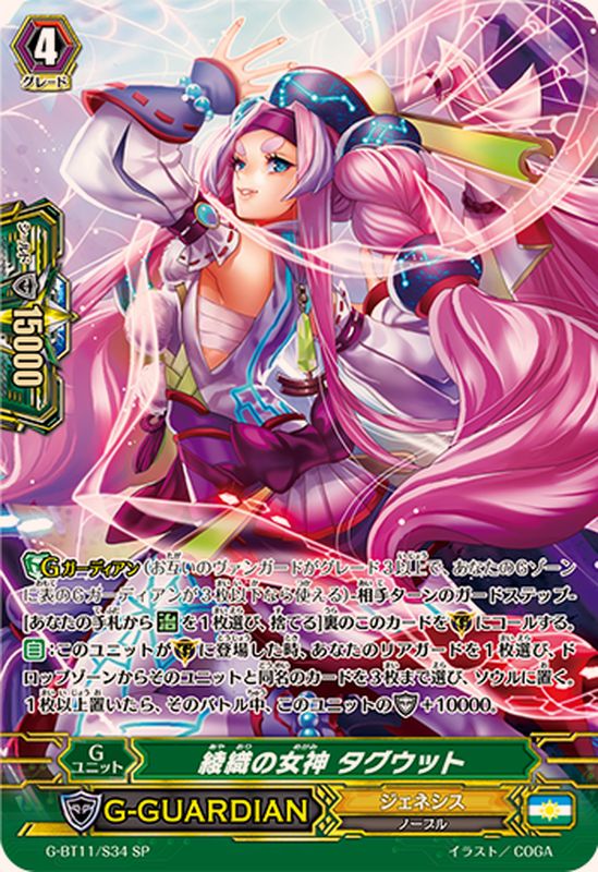 【Gガーディアン】(お互いのヴァンガードがグレード3以上で、あなたのGゾーンに表のGガーディアンが3枚以下なら使える)-相手ターンのガードステップ-[あなたの手札から【治】を1枚選び、捨てる]裏のこのカードを(G)にコールする。【自】:このユニットが(G)に登場した時、あなたのリアガードを1枚選び、ドロップゾーンからそのユニットと同名のカードを3枚まで選び、ソウルに置く。1枚以上置いたら、そのバトル中、このユニットのシールド+10000。