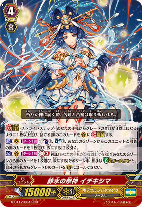 【超越】-ストライドステップ-[あなたの手札からグレードの合計が3以上になるように1枚以上選び、捨てる]裏のこのカードを(V)に【超越】する。【起】【(V)】【ターン1回】:[【カウンターブラスト】(1),【ソウルブラスト】(1),あなたのGゾーンからこのユニットと同名の裏のカードを1枚選び、表にする]2枚引く。【起】【(V)】【ターン1回】【Gブレイク】(3)神託(あなたの手札が5枚以上で有効):[あなたのGゾーンから裏のカードを1枚選び、表にする]そのターン中、相手は【Gガーディアン】と、自分の手札からグレード0のカードを(G)にコールできない。
