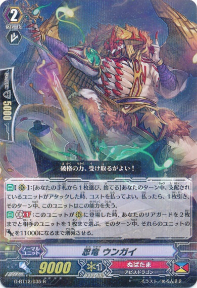 【自】【(R)】:[あなたの手札から1枚選び、捨てる]あなたのターン中、支配されているユニットがアタックした時、コストを払ってよい。払ったら、1枚引き、そのターン中、このユニットはこの能力を失う。【自】【Gブレイク】(1):このユニットが(R)に登場した時、あなたのリアガードを2枚までと相手のユニットを1枚まで選ぶ。そのターン中、それらのユニットのパワーを11000になるまで増減させる。
