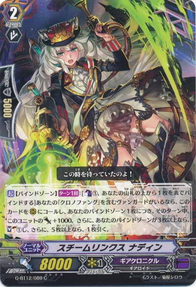 【起】【バインドゾーン】【ターン1回】:[【カウンターブラスト】(1),あなたの山札の上から1枚を表でバインドする]あなたの「クロノファング」を含むヴァンガードがいるなら、このカードを(R)にコールし、あなたのバインドゾーン1枚につき、そのターン中、このユニットのパワー+1000。さらに、あなたのバインドゾーンが3枚以上なら、【ソウルチャージ】(1)し、さらに、5枚以上なら、1枚引く。