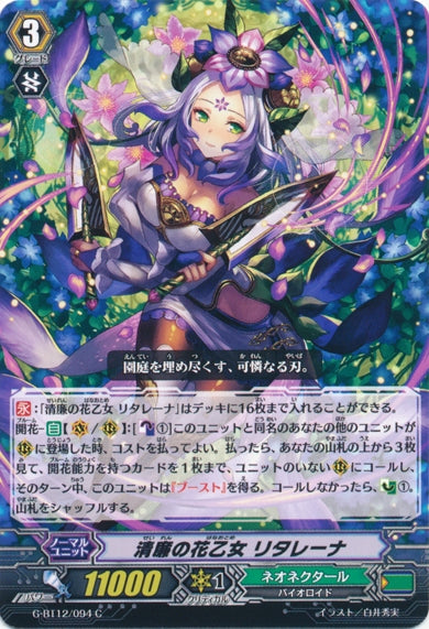 【永】:「清廉の花乙女 リタレーナ」はデッキに16枚まで入れることができる。開花-【自】【(V)/(R)】:[【カウンターブラスト】(1)]このユニットと同名のあなたの他のユニットが(R)に登場した時、コストを払ってよい。払ったら、あなたの山札の上から3枚見て、開花能力を持つカードを1枚まで、ユニットのいない(R)にコールし、そのターン中、このユニットは『ブースト』を得る。コールしなかったら、【カウンターチャージ】(1)。山札をシャッフルする。