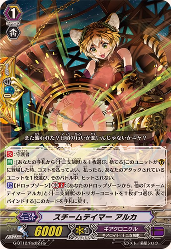 【永】:守護者【自】:[あなたの手札から〈十二支刻獣〉を1枚選び、捨てる]このユニットが(G)に登場した時、コストを払ってよい。払ったら、あなたのアタックされているユニットを1枚選び、そのバトル中、ヒットされない。【起】【ドロップゾーン】【Gブレイク】(2):[あなたのドロップゾーンから、他の「スチームテイマー アルカ」と〈十二支刻獣〉のトリガーユニットを1枚ずつ選び、表でバインドする]このカードを手札に戻す。