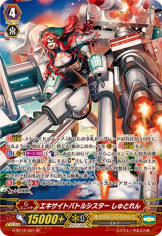 【超越】-ストライドステップ-[あなたの手札からグレードの合計が3以上になるように1枚以上選び、捨てる]裏のこのカードを(V)に【超越】する。【起】【(V)】【ターン1回】:[【カウンターブラスト】(1),あなたのGゾーンからこのユニットと同名の裏のカードを1枚選び、表にする]【ソウルチャージ】(1)してよい。さらに、あなたの山札の上から、あなたの「バトルシスター」を含むリアガードと同じ枚数見て、見たカードをそれぞれ山札の上か下に好きな順番で置く。【永】【(V)】【Gブレイク】(3):あなたの「バトルシスター」を含むリアガードすべてのパワー+3000。