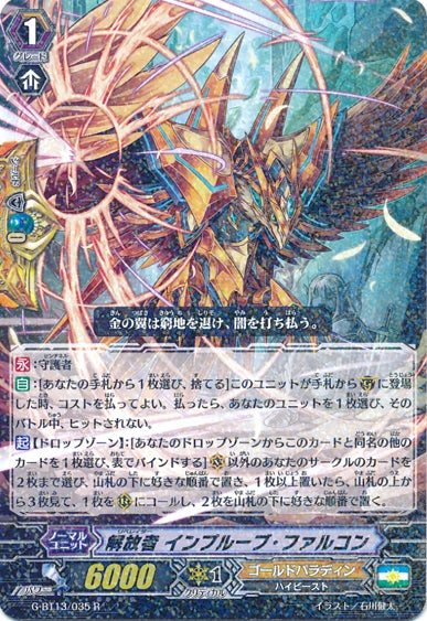 【永】:守護者【自】:[あなたの手札から1枚選び、捨てる]このユニットが手札から(G)に登場した時、コストを払ってよい。払ったら、あなたのユニットを1枚選び、そのバトル中、ヒットされない。【起】【ドロップゾーン】:[あなたのドロップゾーンからこのカードと同名の他のカードを1枚選び、表でバインドする](V)以外のあなたのサークルのカードを2枚まで選び、山札の下に好きな順番で置き、1枚以上置いたら、山札の上から3枚見て、1枚を(R)にコールし、2枚を山札の下に好きな順番で置く。