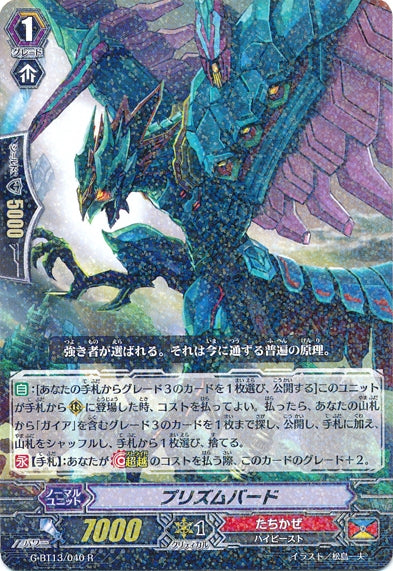 【自】:[あなたの手札からグレード3のカードを1枚選び、公開する]このユニットが手札から(R)に登場した時、コストを払ってよい。払ったら、あなたの山札から「ガイア」を含むグレード3のカードを1枚まで探し、公開し、手札に加え、山札をシャッフルし、手札から1枚選び、捨てる。【永】【手札】:あなたが【超越】のコストを払う際、このカードのグレード+2。