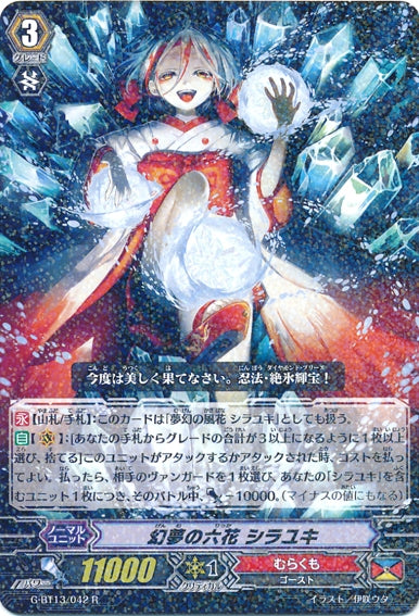 【永】【山札/手札】:このカードは「夢幻の風花 シラユキ」としても扱う。【自】【(V)】:[あなたの手札からグレードの合計が3以上になるように1枚以上選び、捨てる]このユニットがアタックするかアタックされた時、コストを払ってよい。払ったら、相手のヴァンガードを1枚選び、あなたの「シラユキ」を含むユニット1枚につき、そのバトル中、パワー-10000。(マイナスの値にもなる)