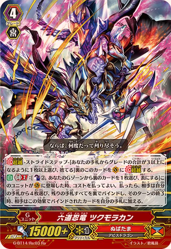 【超越】-ストライドステップ-[あなたの手札からグレードの合計が3以上になるように1枚以上選び、捨てる]裏のこのカードを(V)に【超越】する。【自】【Gブレイク】(2):[【カウンターブラスト】(2),あなたのGゾーンから裏のカードを1枚選び、表にする]このユニットが(V)に登場した時、コストを払ってよい。払ったら、相手は自分の手札から4枚選び、残りの手札すべてを裏でバインドし、そのターンの終了時、相手はこの効果でバインドされたカードを自分の手札に加える。