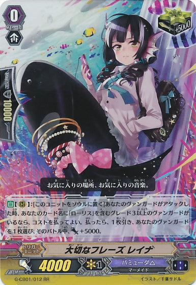 アップデート:シールド、トリガー、テキスト【自】【(R)】:「ローリス」を含むグレード3以上のあなたのヴァンガードがアタックした時、【コスト】[このユニットをソウルに置く]ことで、1枚引き、あなたのヴァンガードを1枚選び、そのバトル中、パワー+5000。【自】:このカードがダメージチェックで出た時、1枚引く。