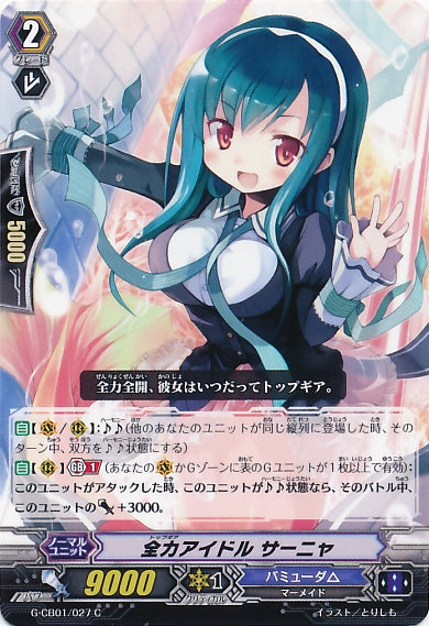 【自】【(V)/(R)】:♪♪(他のあなたのユニットが同じ縦列に登場した時、そのターン中、双方を♪♪状態にする)【自】【(R)】【Gブレイク】(1)(あなたの(V)かGゾーンに表のGユニットが1枚以上で有効):このユニットがアタックした時、このユニットが♪♪状態なら、そのバトル中、このユニットのパワー+3000。
