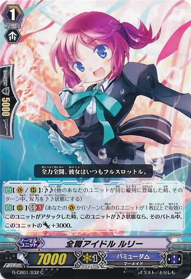 【自】【(V)/(R)】:♪♪(他のあなたのユニットが同じ縦列に登場した時、そのターン中、双方を♪♪状態にする)【自】【(R)】【Gブレイク】(1)(あなたの(V)かGゾーンに表のGユニットが1枚以上で有効):このユニットがアタックした時、このユニットが♪♪状態なら、そのバトル中、このユニットのパワー+3000。
