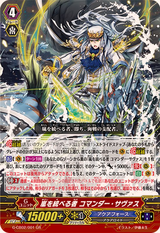 【超越】(お互いのヴァンガードがグレード3以上で解放!)-ストライドステップ-[あなたの手札からグレードの合計が3以上になるように1枚以上選び、捨てる]裏のこのカードを (V)に【超越】する。【起】【(V)】【ターン1回】:[あなたのGゾーンから裏の「嵐を統べる者 コマンダー・サヴァス」を1枚選び、表にする]あなたのリアガードを1枚まで選び、そのターン中、パワー+5000し、『【永】【(R)】:このユニットは後列からアタックできる。』を与え、そのターン中、このユニットは『【自】【(V)】【Gブレイク】(3)連波-4回目のみ(各ターンの指定されたバトルで有効):あなたのユニットがヴァンガードにアタックした時、相手のリアガードを3枚選び、相手はその中から1枚選び、退却させる。』を得る。