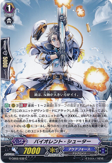 【自】【(R)】【Gブレイク】(1)連波-1~2回目:ヴァンガードにアタックした時、【コスト】[【ソウルブラスト】(1)]することで、そのバトル中、このユニットのパワー+2000し、そのバトル終了時、あなたの山札を上から4枚見て、連波能力を持つカードを1枚まで探し、このユニットのいる(R)にコールし、残りのカードを山札の下に望む順で置く。コールしたら、あなたのドロップゾーンから「バイオレント・シューター」を1枚山札の下に置く。
