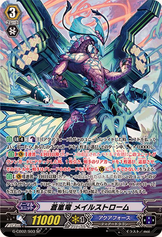 【自】【リミットブレイク】(4):[【カウンターブラスト】(1)]《アクアフォース》がこのユニットにライドした時、コストを払ってよい。払ったら、あなたのヴァンガードを1枚まで選び、そのターン中、パワー+10000し、『【自】【(V)】連波-4回目以降(各ターンの指定されたバトルで有効):このユニットがヴァンガードにアタックした時、1枚引き、相手のリアガードを1枚選び、退却させ、そのバトル中、相手はグレード0のカードを手札から(G)にコールできない。』を与える。【自】【(V)】連波-3回目以降(各ターンの指定されたバトルで有効):このユニットのアタックがヴァンガードにヒットした時、あなたの山札からカード名に「メイルストローム」を含むカードを1枚まで探し、相手に見せ、手札に加え、その山札をシャッフルする。