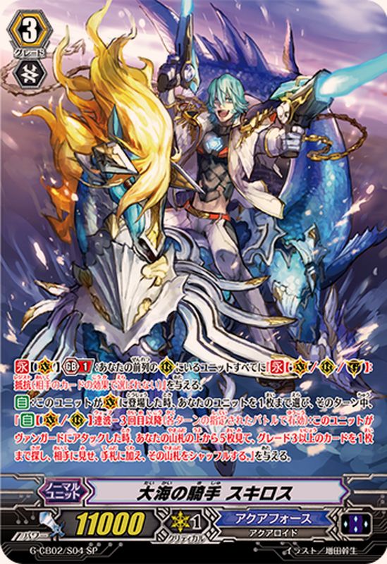 【永】【(V)】【Gブレイク】(1):あなたの前列の(R)にいるユニットすべてに『【永】【 (V)/(R)/(G)】:抵抗(相手のカードの効果で選ばれない)』を与える。【自】:このユニットが (V)に登場した時、あなたのユニットを1枚まで選び、そのターン中、『【自】【 (V)/(R)】連波-3回目以降(各ターンの指定されたバトルで有効):このユニットがヴァンガードにアタックした時、あなたの山札の上から5枚見て、グレード3以上のカードを1枚まで探し、相手に見せ、手札に加え、その山札をシャッフルする。』を与える。