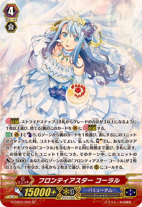 【超越】-ストライドステップ-[手札からグレードの合計が3以上になるように1枚以上選び、捨てる]裏のこのカードを(V)に【超越】する。【自】【(V)】:[【カウンターブラスト】(1),Gゾーンから裏のカードを1枚選び、表にする]このユニットがアタックした時、コストを払ってよい。払ったら、【ソウルチャージ】(1)し、あなたのリアガードをソウルの「コーラル」を含むカードと同じ枚数まで選び、手札に戻す。この効果で戻したユニット1枚につき、そのターン中、このユニットのパワー+5000。あなたのGゾーンの表の「フロンティアスター コーラル」が2枚以上なら、1枚引き、手札から2枚まで選び、別々の(R)にコールする。